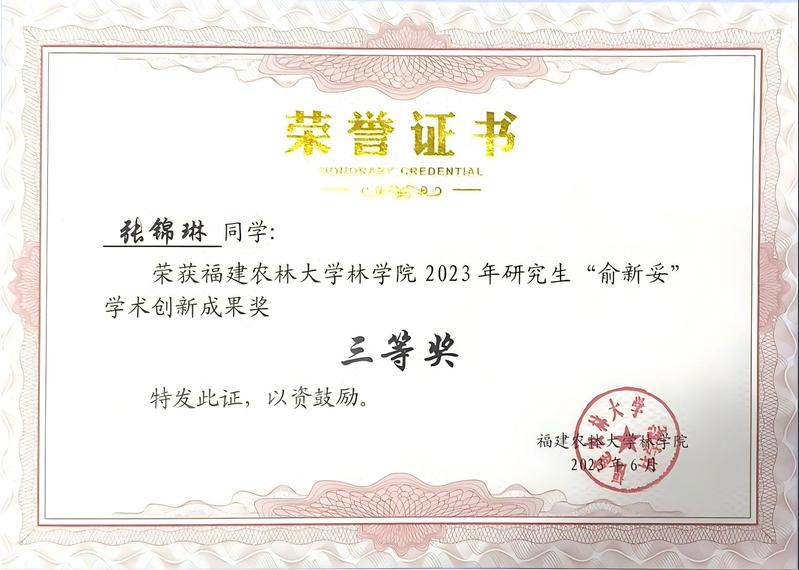 祝贺2021级自然地理学硕士研究生张锦琳,其学术汇报《武夷山小流域生态系统服务(簇)权衡/协同及对地形起伏度的响应》荣获福建农林大学林学院2023年研究生“俞新妥”学术创新成果三等奖。