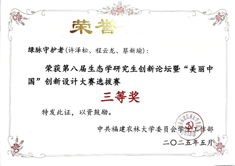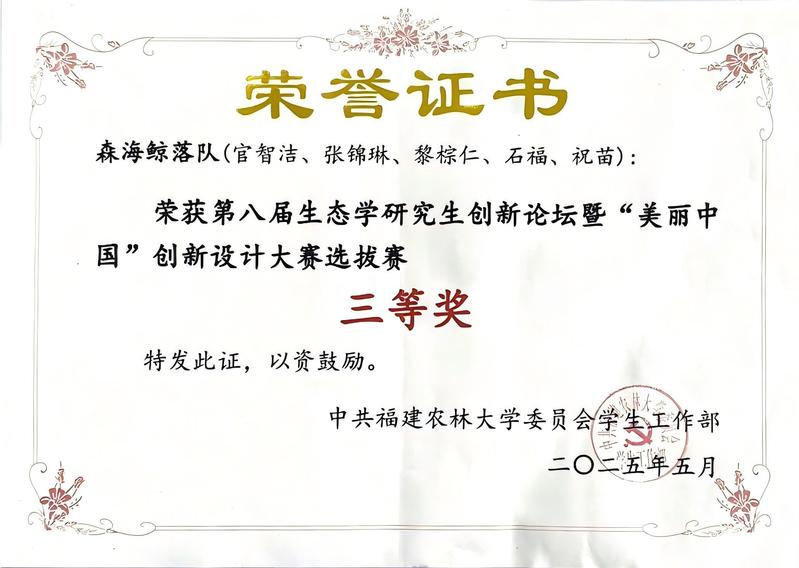 2025年5月,由中共福建农林大学委员会学生工作部主办的第八届生态学研究生创新论坛暨“美丽中国”创新设计大赛选拔赛圆满落幕。课题组两支参赛队伍均荣获三等奖,具体获奖情况如下: