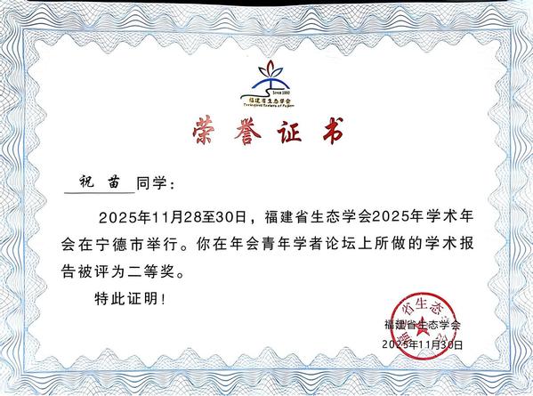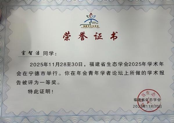 2025年11月,“山海共情,生态先行——福建省生态学会2025年学术年会”顺利举办,课题组两名研究生在年会青年学者论坛中凭借扎实的学术功底与精彩的报告展示脱颖而出,获得多项荣誉,具体如下: