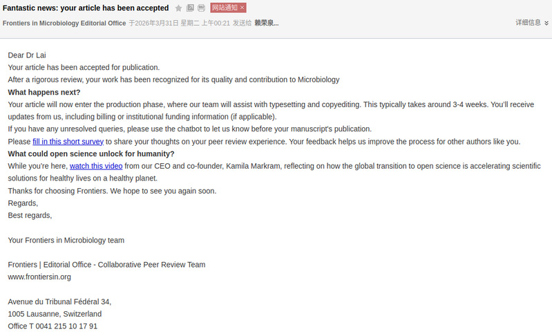课题组Gul Warin KHAN#, Gang GU#, Yufei LAI, Chen YANG, Ting ZHOU*, Rongquan Lai* and Bang ZHANG的论文“ Effects of symbiotic bacteria on the parasitism efficacy of Aphidius gifuensis against Myzus persicae”被《Frontiers in Microbiology》期刊于2026年3月31日早上所接受。特别表扬研二在读留学生Gul Warin KHAN同学对该论文的认真撰写、投稿、修改等!